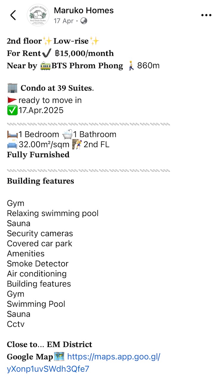 39 Suites near BTS Phrom Phong 32 sqm. 15,000/month 1 bed 1 bathroom for rent fully furnished by Marukohomes Tel:0932767600