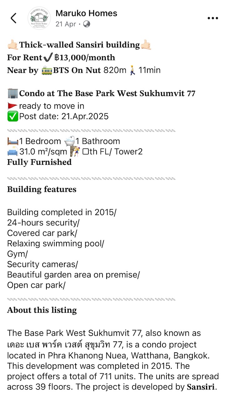 The Base Park Sukhumvit 77 by Sansiri 1 bed 1 bathroom 31 sqm. near BTS On Nut 13,000/month by Marukohomes Tel:0932767600