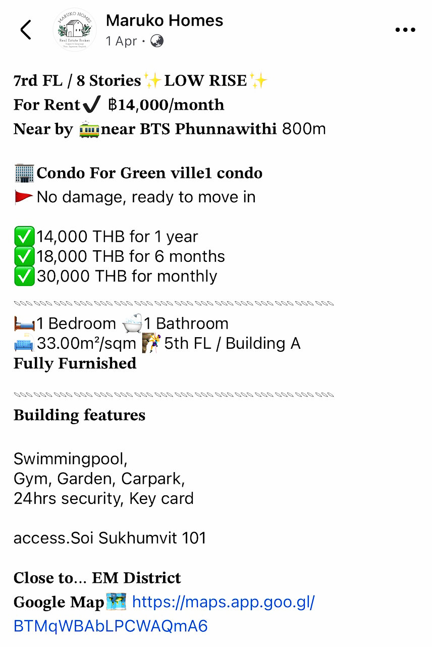 Green Ville 1 near BTS Punnawithi 33 sqm. 14,000/month 1 bed 1 bathroom for rent fully furnished by Marukohomes Tel:0932767600