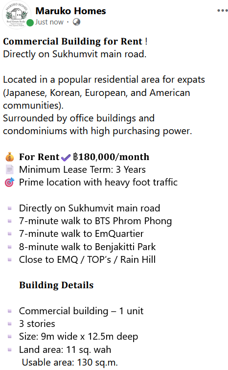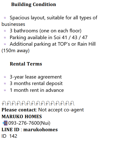 Commercial Building directly on Sukhumvit main road 130 sq.m. 3 bathrooms. Parking available by MARUKO HOMES Tel:0932767600