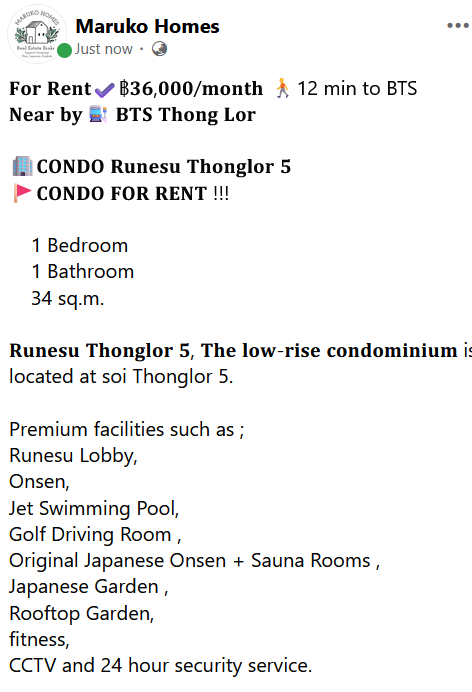 Runesu Thonglor 5 near BTS Thong Lor 1 Bed 1 Bath 34 sq. m. Fully Furnished by MARUKO HOMES Tel:0932767600