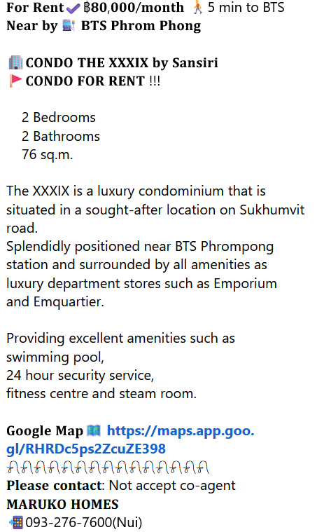 THE XXXIX by Sansiri near BTS Phrom Phong 2 Beds 2 Baths 76 sq. m. Fully Furnished by MARUKO HOMES Tel:0932767600