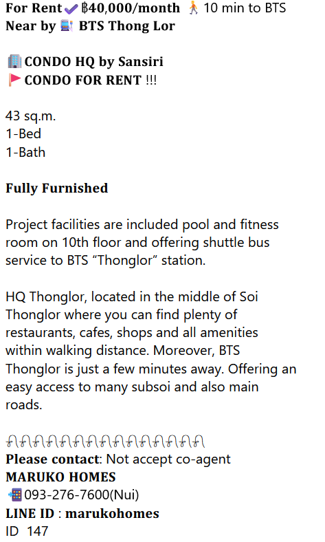 HQ by Sansiri near BTS Thong Lor 1 Bed 1 Bath 43 sq. m. Fully Furnished by MARUKO HOMES Tel:0932767600