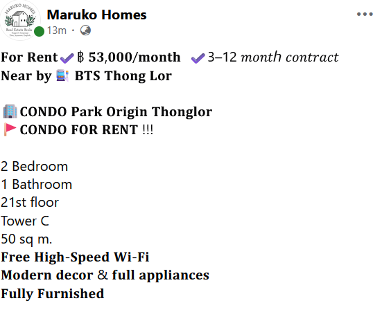Park Origin Thonglor BTS Thong Lor 2 beds 1 Bath 50 sq m. Fully Furnished by MARUKO HOMES Tel:0932767600